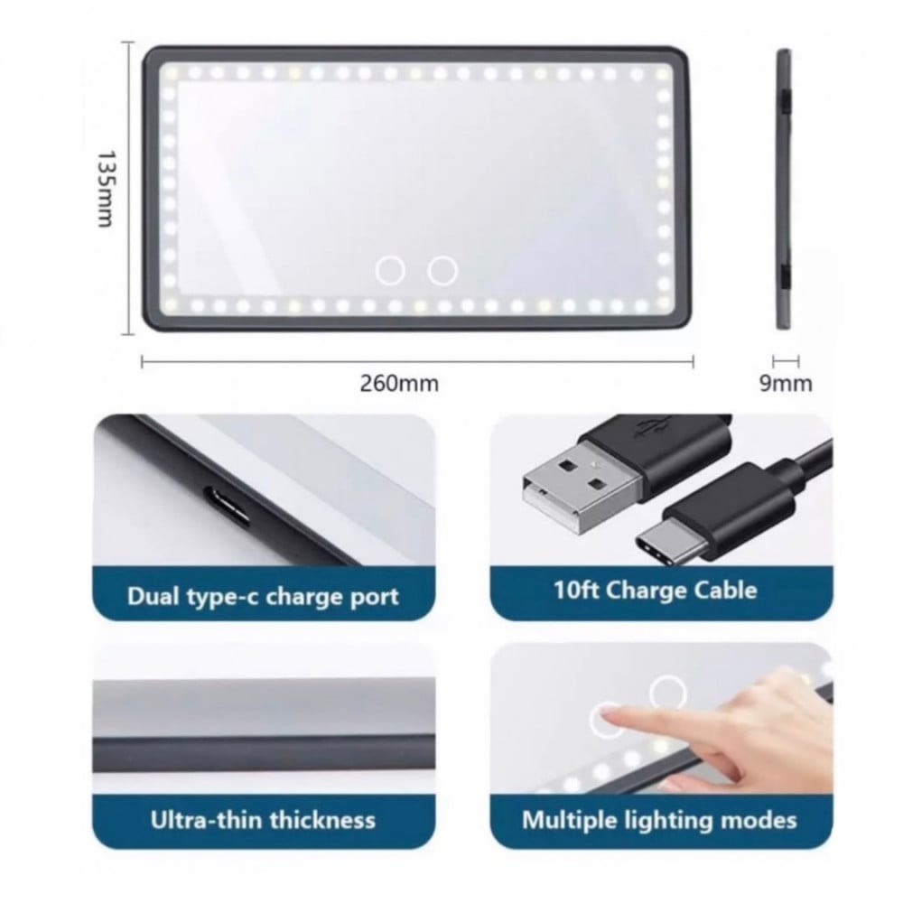 مراية السيارة الداخلية بإضاءة LED بثلاث أنماط اضاءه، المرايا نحيفة للغاية وتعمل بللمس.